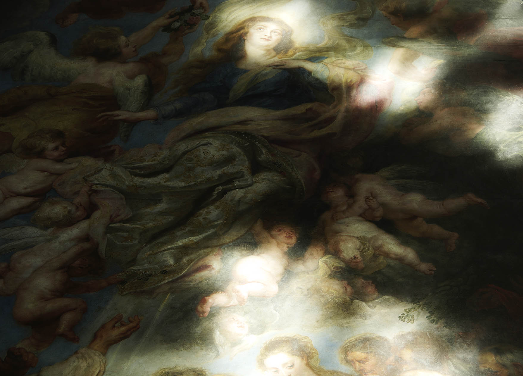 アントワープという都市の聖母大聖堂にある「聖母マリア被昇天」、「キリスト昇架」、「キ リスト降架」という絵がそれに当たります。その実物を見た時に奇跡が・・。 ちょうど絵画の前に行った際にステンドガラス越しに絵画に光が射しこんだのです。 しかも下の部分に最初光が差し込み少しずつ上がって行きあたかも昇天していってい るかのように見えるアングルワークで光が動いて行ったのです。